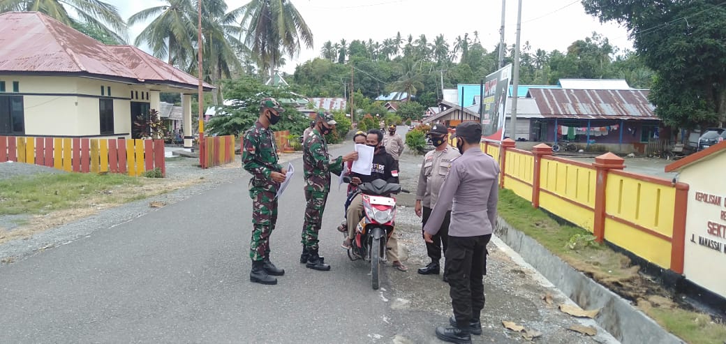 Luwuk Today, Aparat gabungan TNI-Polri di Kecamatan Lamala, Kabupaten Banggai terus kompak dan bersinergi. Kali ini keduanya turun kejalan membagikan selebaran kertas berisikan Maklumat Kepala Kepolisian Indonesia, Kamis (7/1/2021).