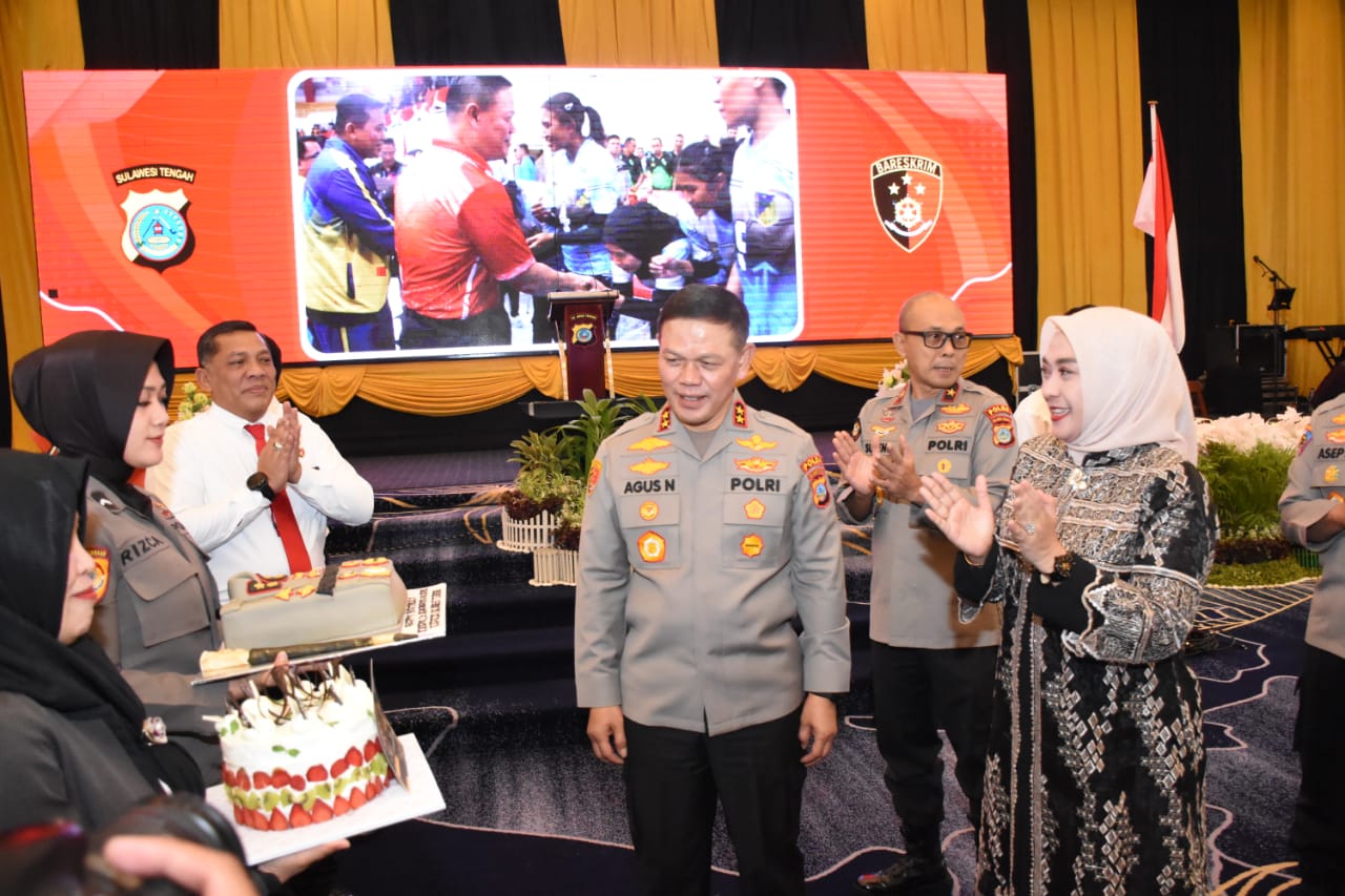 Perasaan haru, bahagia dan bangga tentu bercampur aduk dihati Agus Nugroho yang tidak menyangka hari lahirnya dirayakan bersamaan pelaksanaan Rakernis fungsi Reskrim.