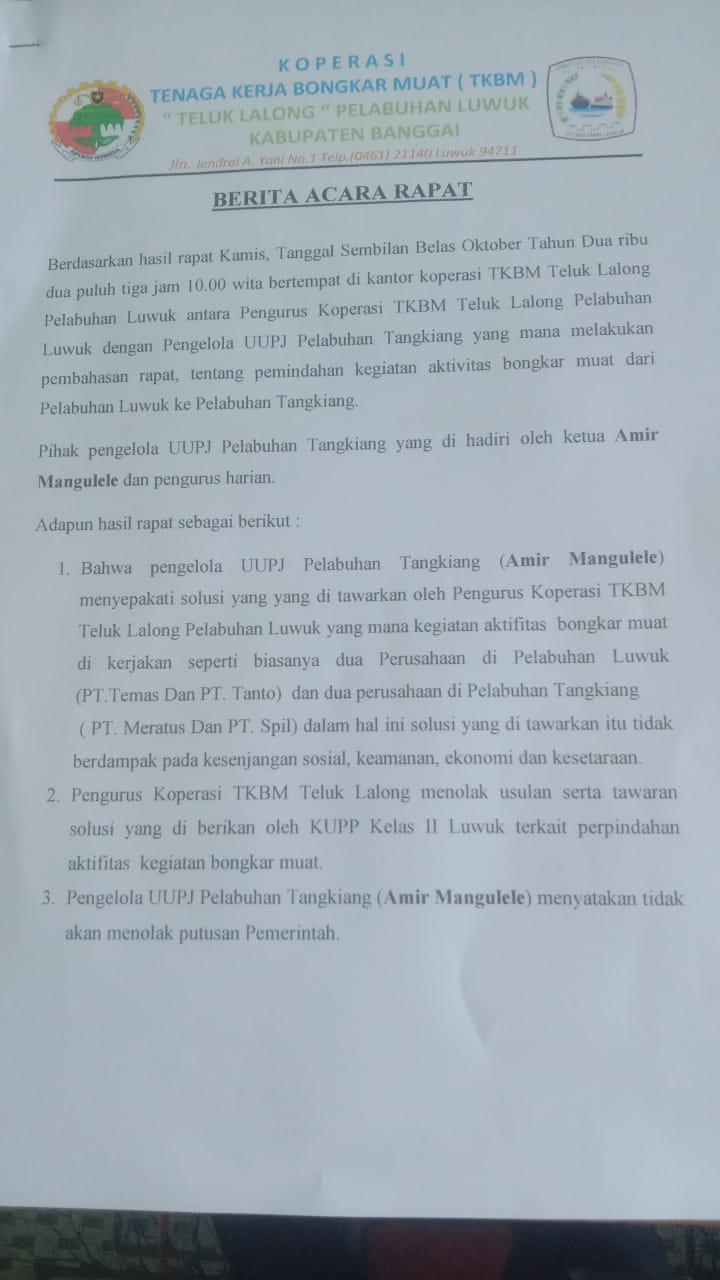 - Pengurus Koperasi TKBM Teluk Lalong menolak usulan serta tawaran solusi yang diberikan oleh KUPP Kelas II Luwuk terkait perpindahan aktivitas kegiatan bongkar muat.