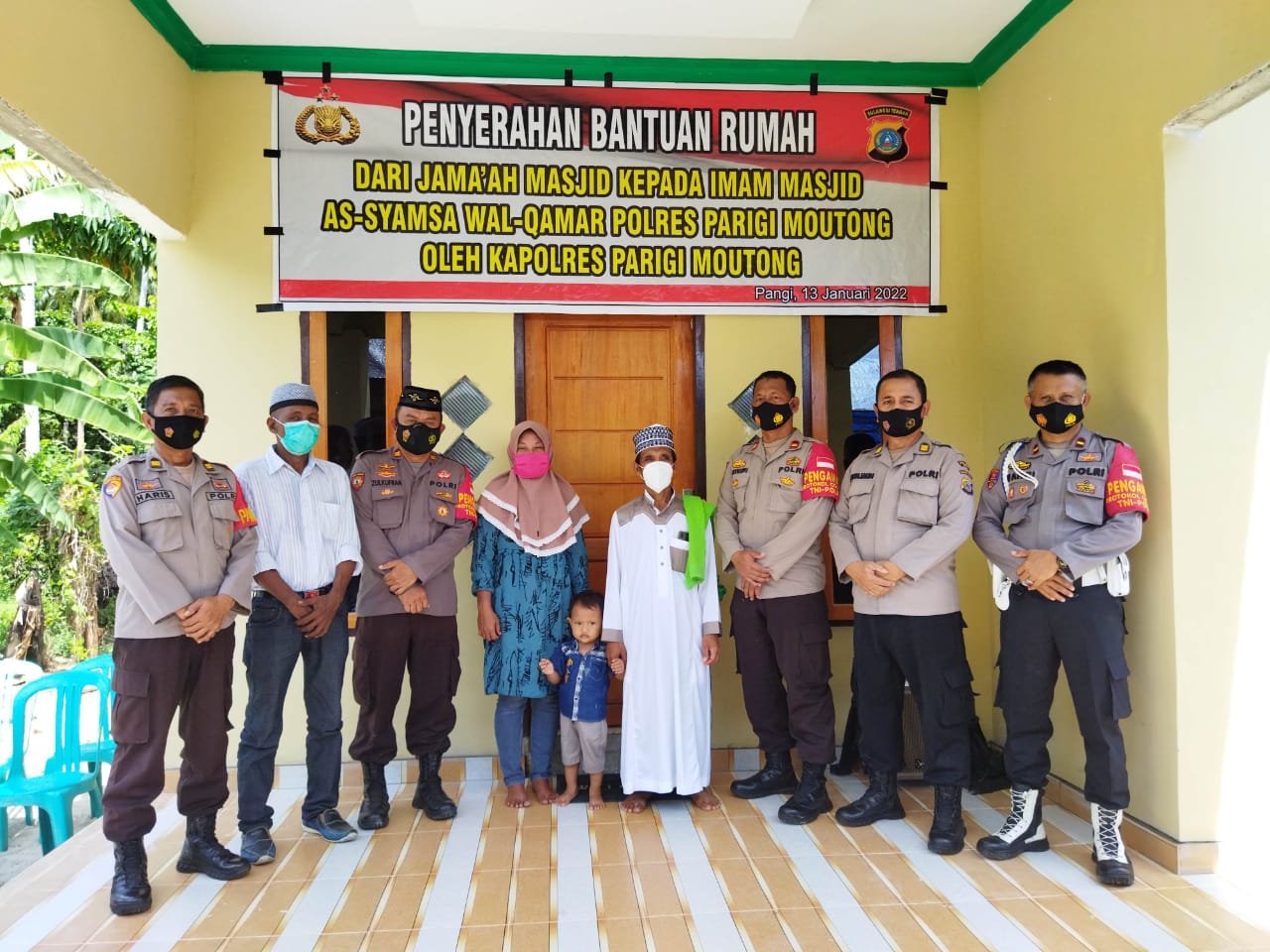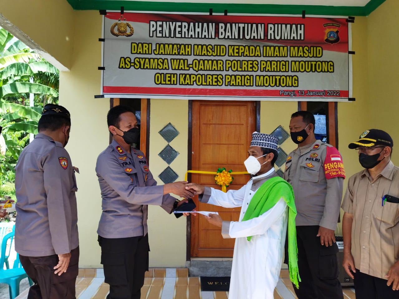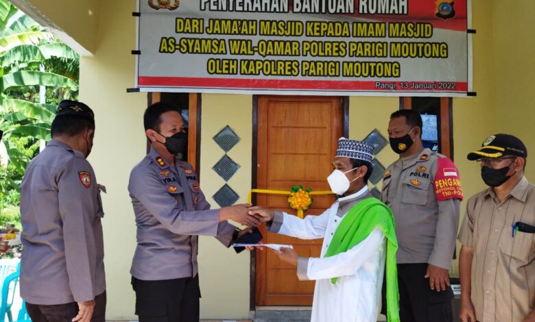 “Hari ini secara simbolis saya serahkan bantuan rumah untuk Imam masjid As Syamsa Walqamar Polres Parigi Moutong,” demikian Kapolres Parimo saat menyerahkan rumah kepada Imam masjid Ustadz Jamrut disaksikan staf dan tokoh masyarakat setempat,