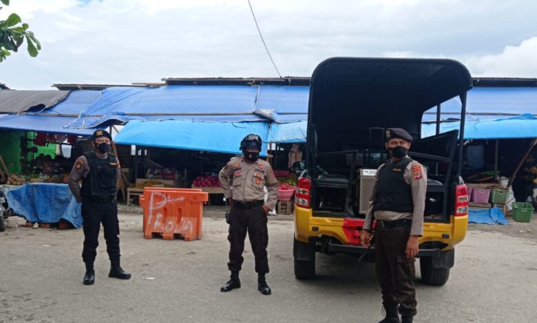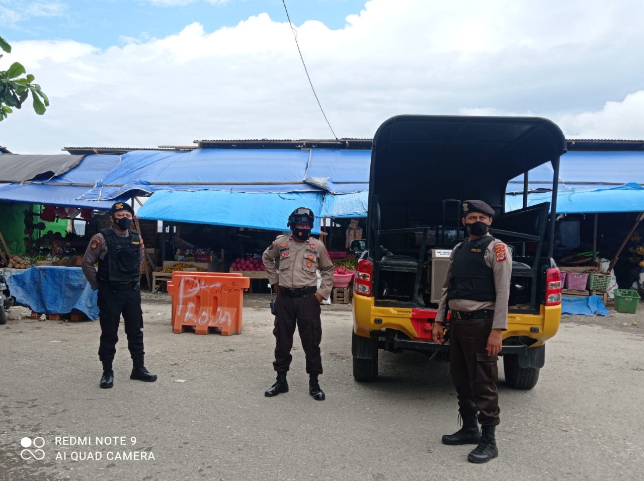 Luwuk.today, Personel Satuan Sabhara Polres Banggai melakukan sosialisasi protokol kesehatan (prokes) 5M kepada masyarakat dengan menggunakan mobil patroli di Pasar Simpong, Kecamatan Luwuk Selatan, Kabupaten Banggai, Senin (13/9/2021).