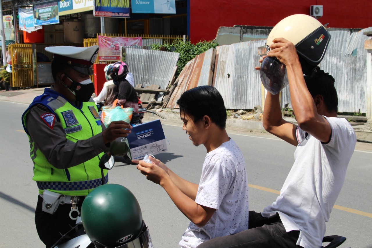 “Hari ini jumlah Brosur sebanyak 250 lembar, masker 350 lembar dan stiker 150 lembar yang dibagikan kepada pengendara,” ungkap Kasat Lantas.