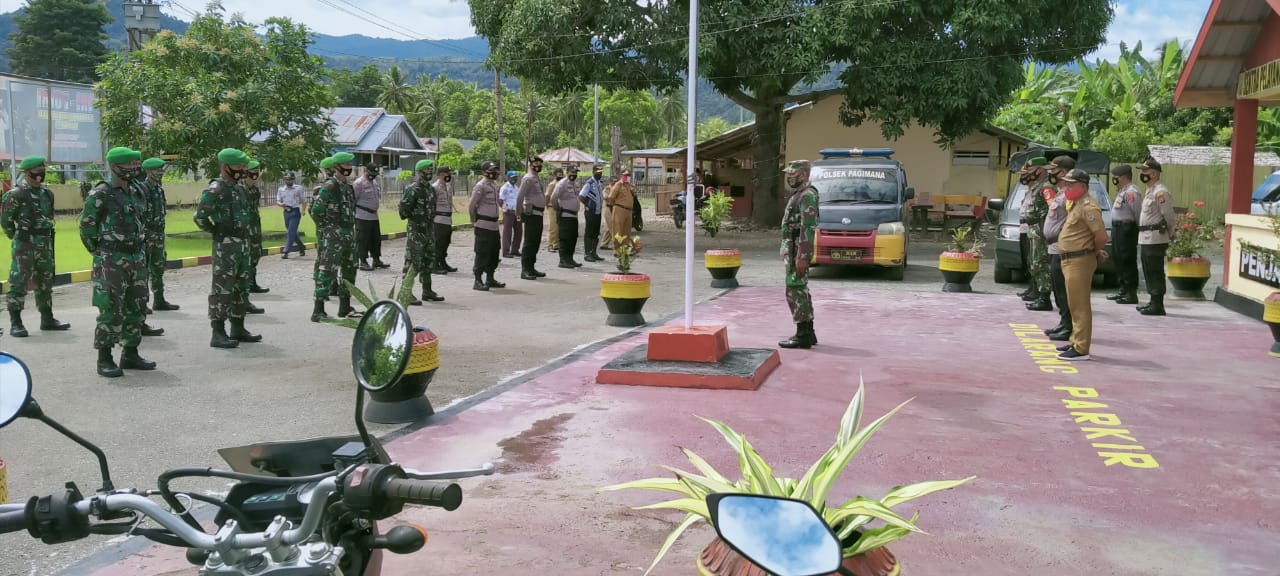 Luwuk Today, Pagimana – Menjelang pengamanan tahapan voting day 9 Desember Pilkada Serentak tahun 2020 nanti, TNI-Polri, Pemerintah Kecamatan Pagimana dan ASN menggelar apel gabungan di halaman Mapolsek Pagimana, Selasa (1/12).