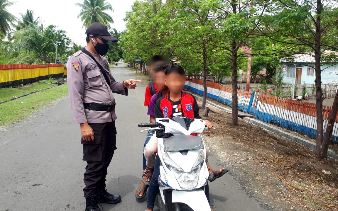 Luwuk Today, Bualemo – Personel Polsek Bualemo menegur tiga pengendara di bawah umur yang mengendarai sepeda motor dan berboncengan tiga serta tanpa menggunakan helm saat menggelar razia di Jalan Trans Desa Bualemo A, Kecamatan Bualemo, Kabupaten Banggai, Senin (30/11).