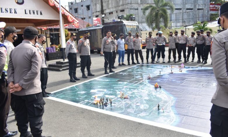 Luwuk.today, Polres Banggai menggelar Latihan Tactikal Floor Game (TFG) dalam rangka persiapan pengamanan Pilkades serentak tahun 2021, di halaman Mapolsek Luwuk, Senin (25/10/2021).