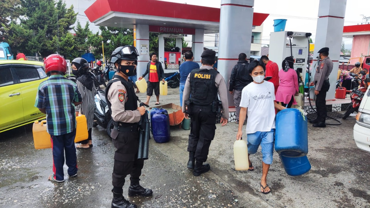 Luwuk.today, Personil Polres Banggai menertibkan antrian jeriken di sejumlah SPBU di Kota Luwuk, Kabupaten Banggai, Selasa (9/11/2021).