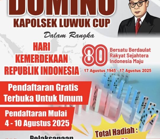 Luwuk.today, Banggai – Dalam rangka memperingati Hari Ulang Tahun (HUT) ke-80 Republik Indonesia, Polsek Luwuk akan mengadakan lomba domino yang meriah pada Senin, 11 Agustus 2025, pukul 19.30 WITA, di Mapolsek Luwuk. Acara ini terbuka untuk umum dengan pendaftaran gratis dan memperebutkan hadiah berupa piala serta uang pembinaan dengan total Rp10 juta.